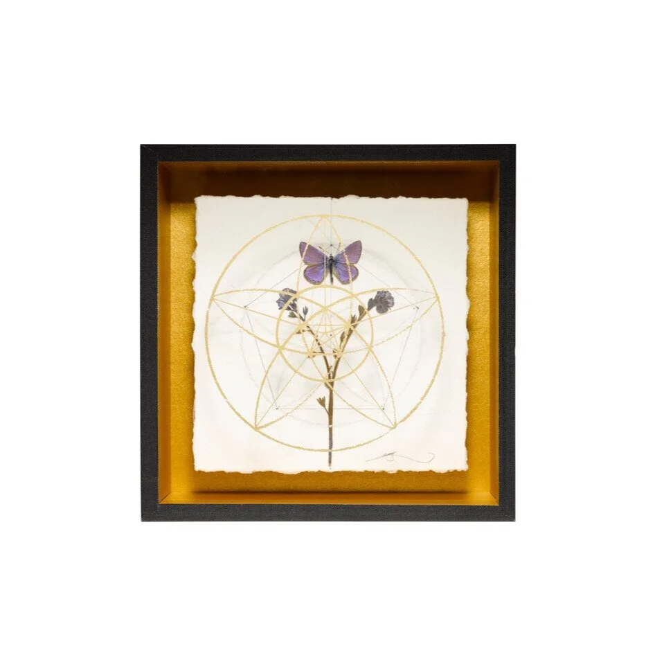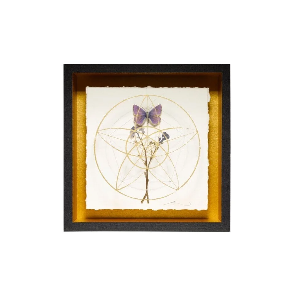 Geometric drawing on paper, dried Forget Me Not pressed flower on pinned Common Blue Butterfly.