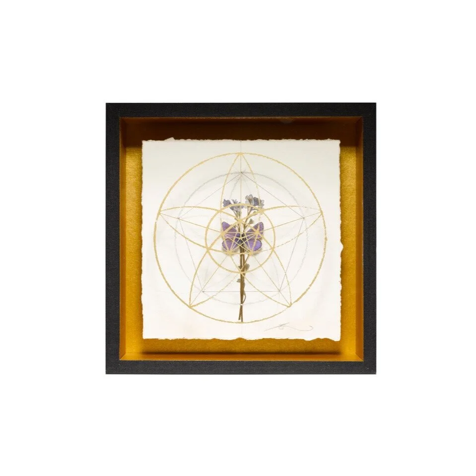 Framed with acetate prints from my meadow and screen printed geometry in black cloth boxes lined with gold paper.